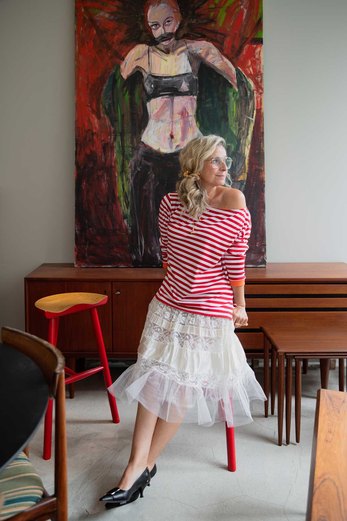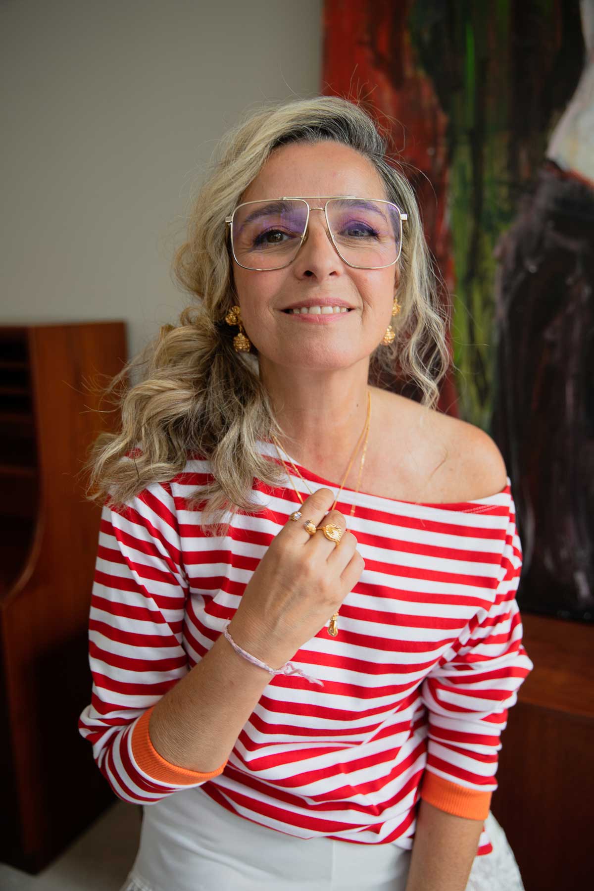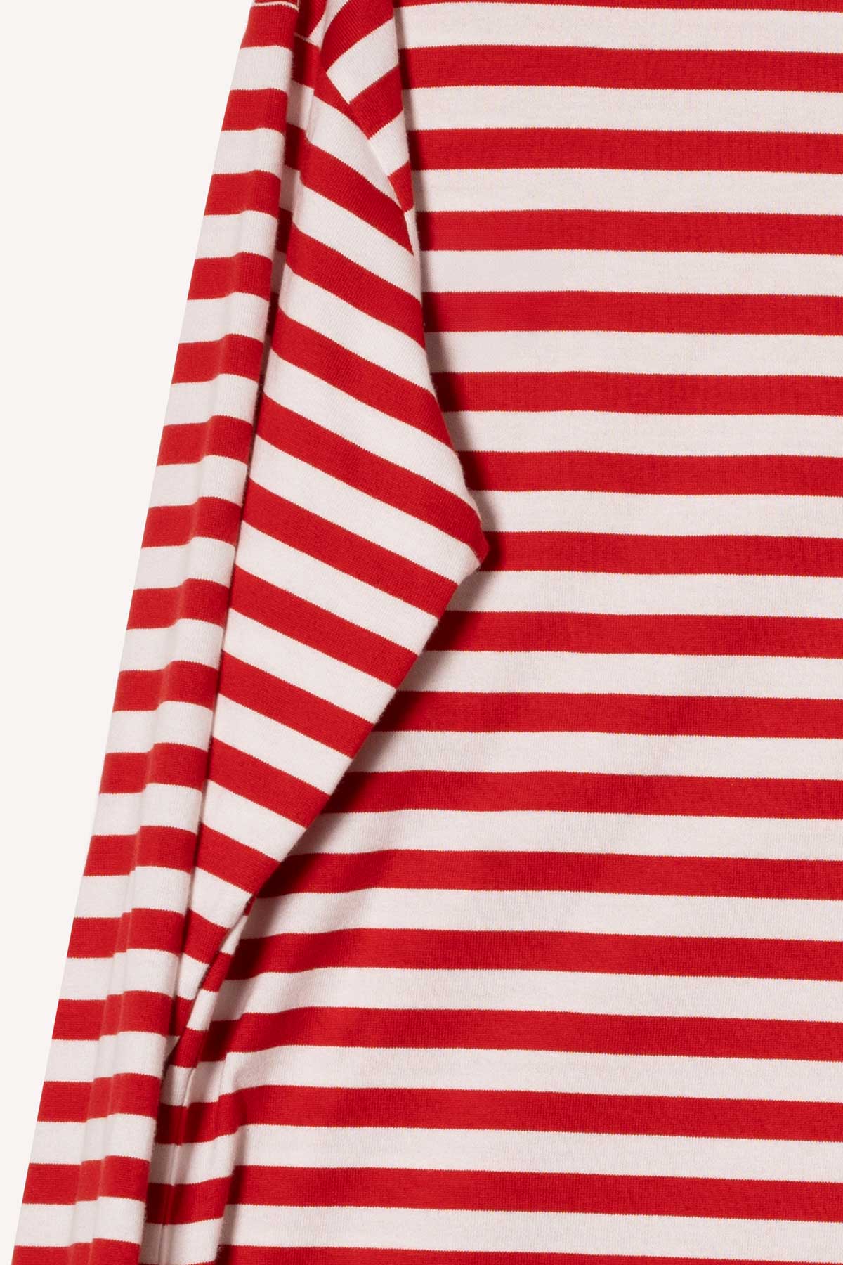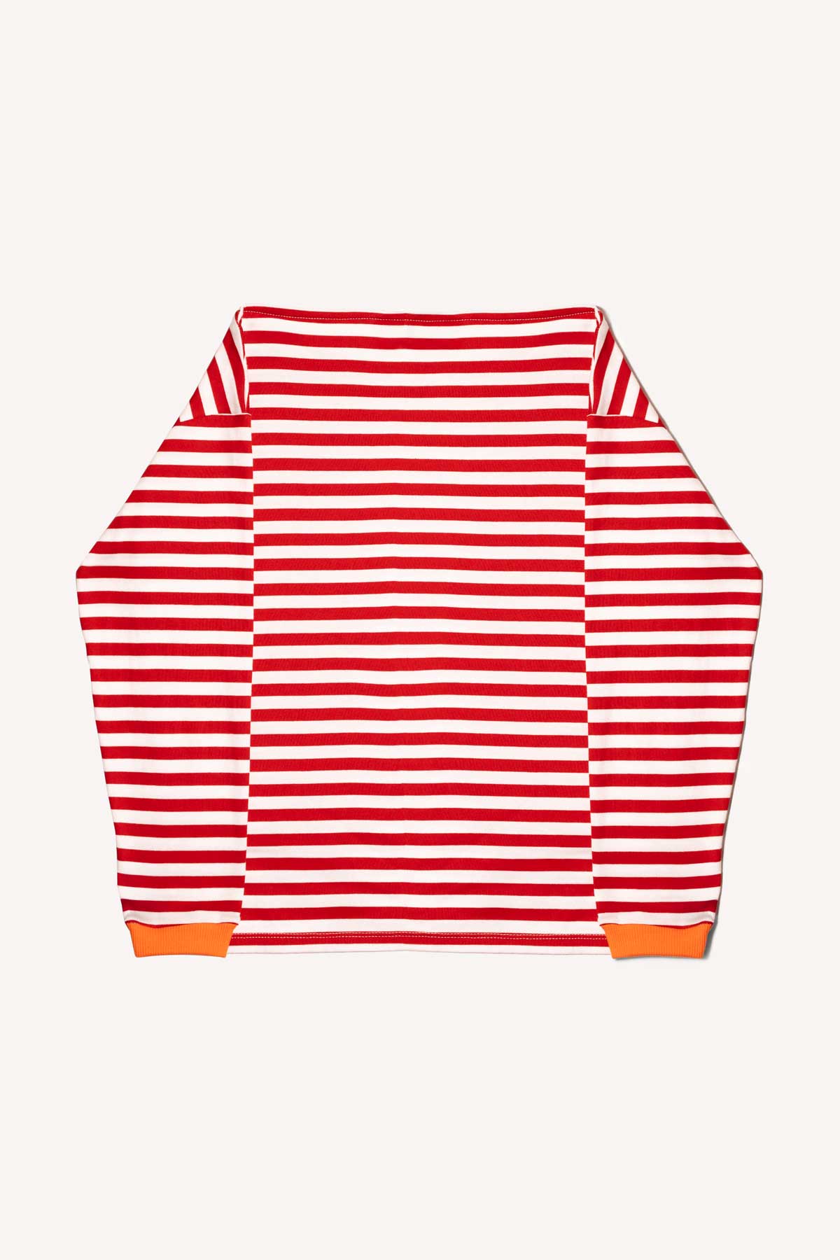 Sweat vermelha e branca com manga e ribe laranja nas mangas. Decote me barco.