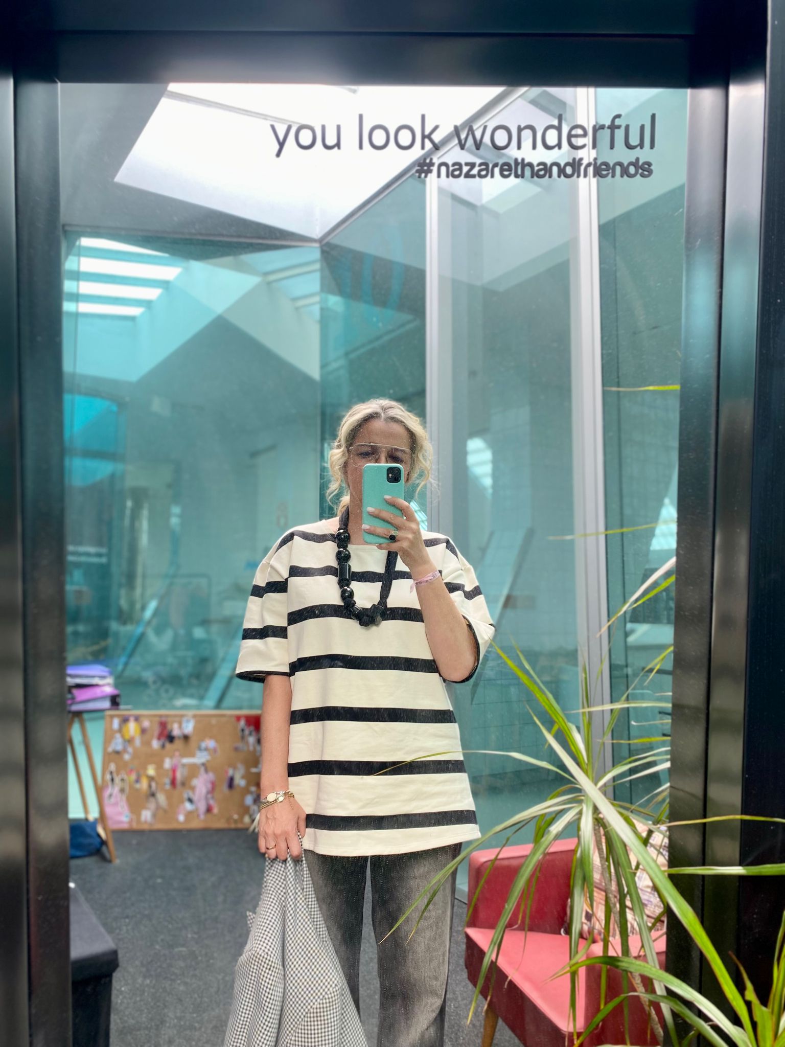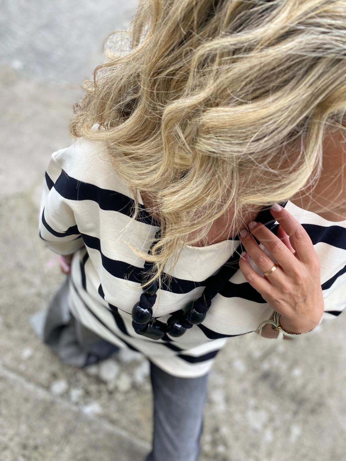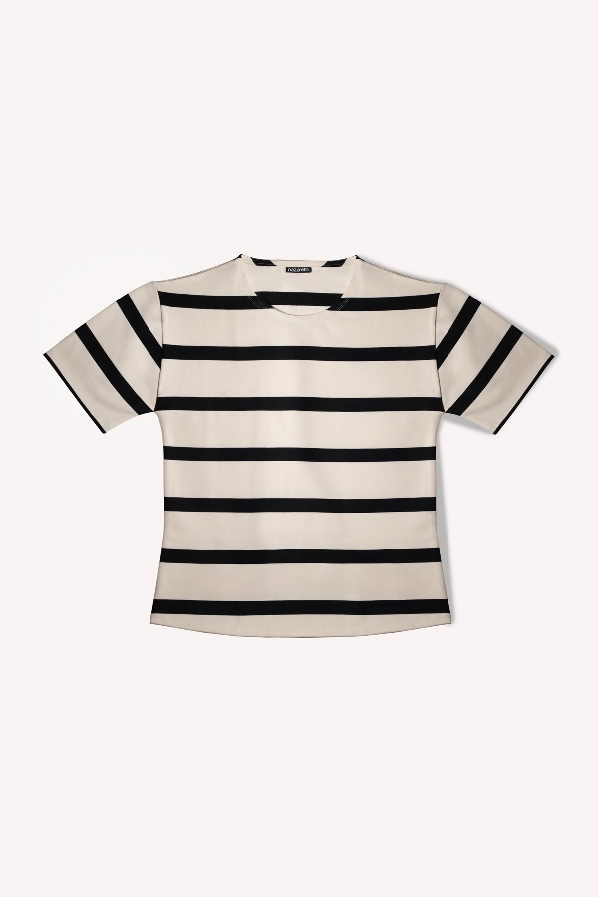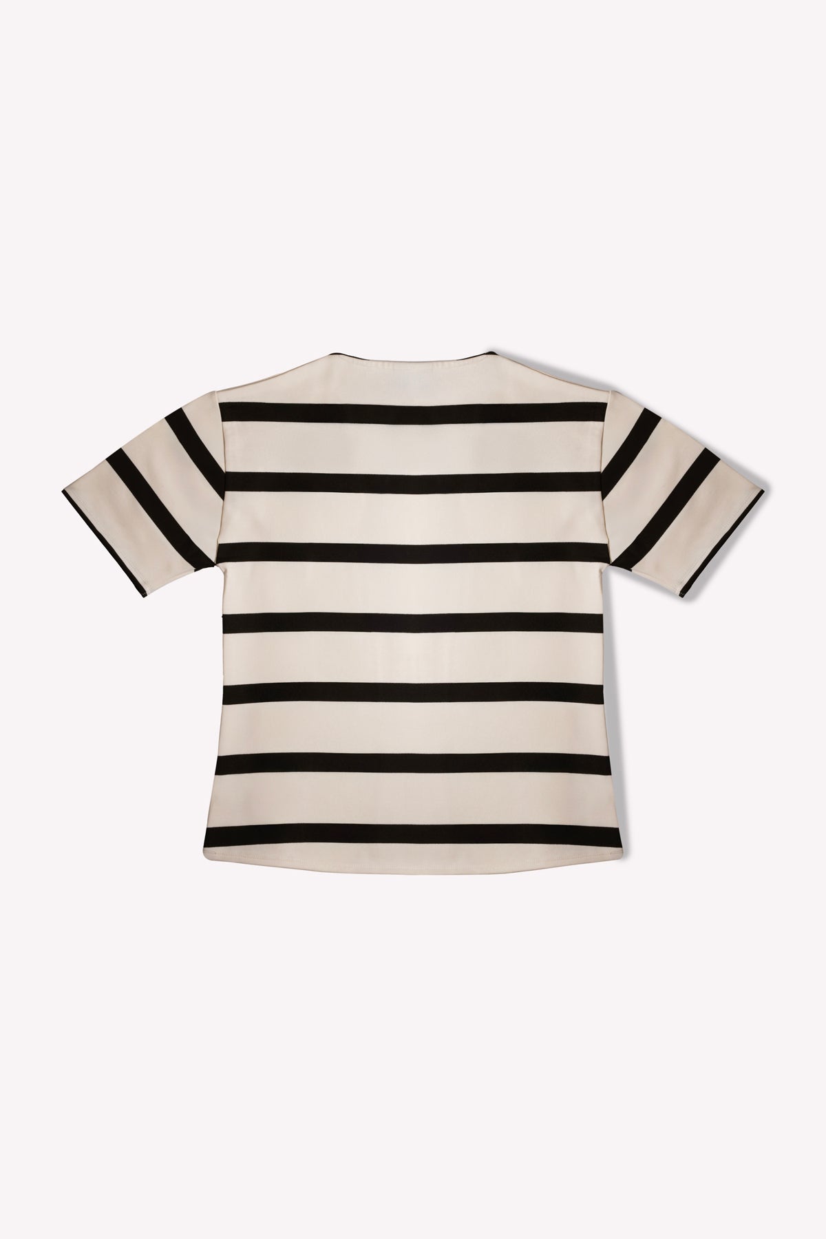 O corte oversize abraça o corpo com leveza e estrutura. Ombros descaídos, decote amplo e mangas até ao cotovelo criam uma silhueta fluida, descontraída, que vive entre o feminino e o masculino — sem rótulos, sem esforço.