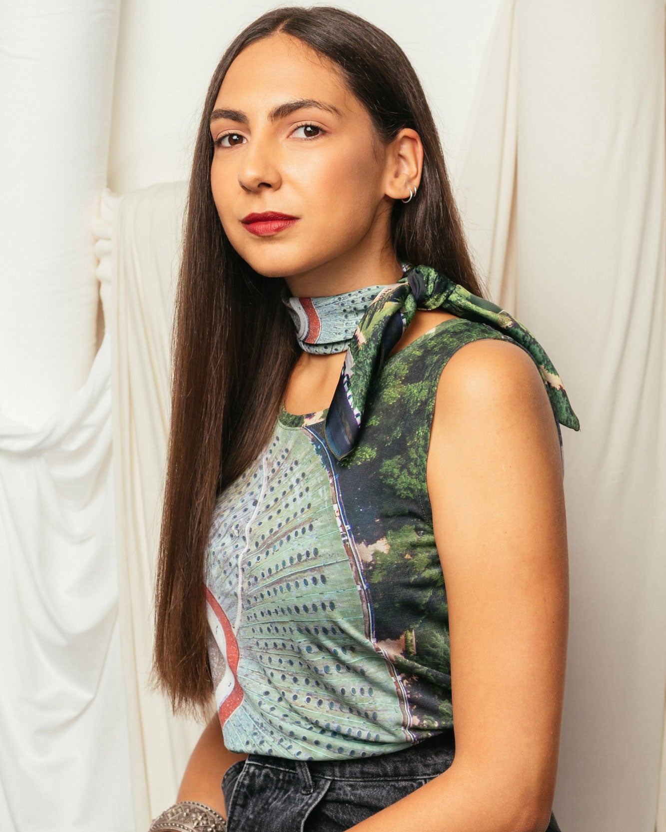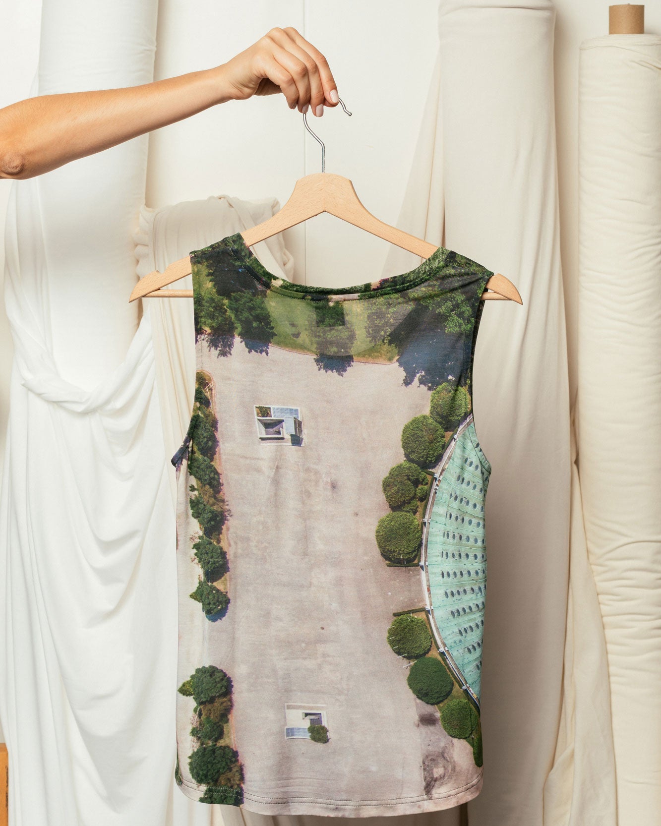 Sleeveless T-shirt, 100% lyocel, 170g/m2, round neckline, 360º digital print, aerial photograph of the wonderful Palácio de Cristal, a building that stands out in the city's history. Fabric reuse, less waste, less water, less energy, less carbon, more environmentally friendly.