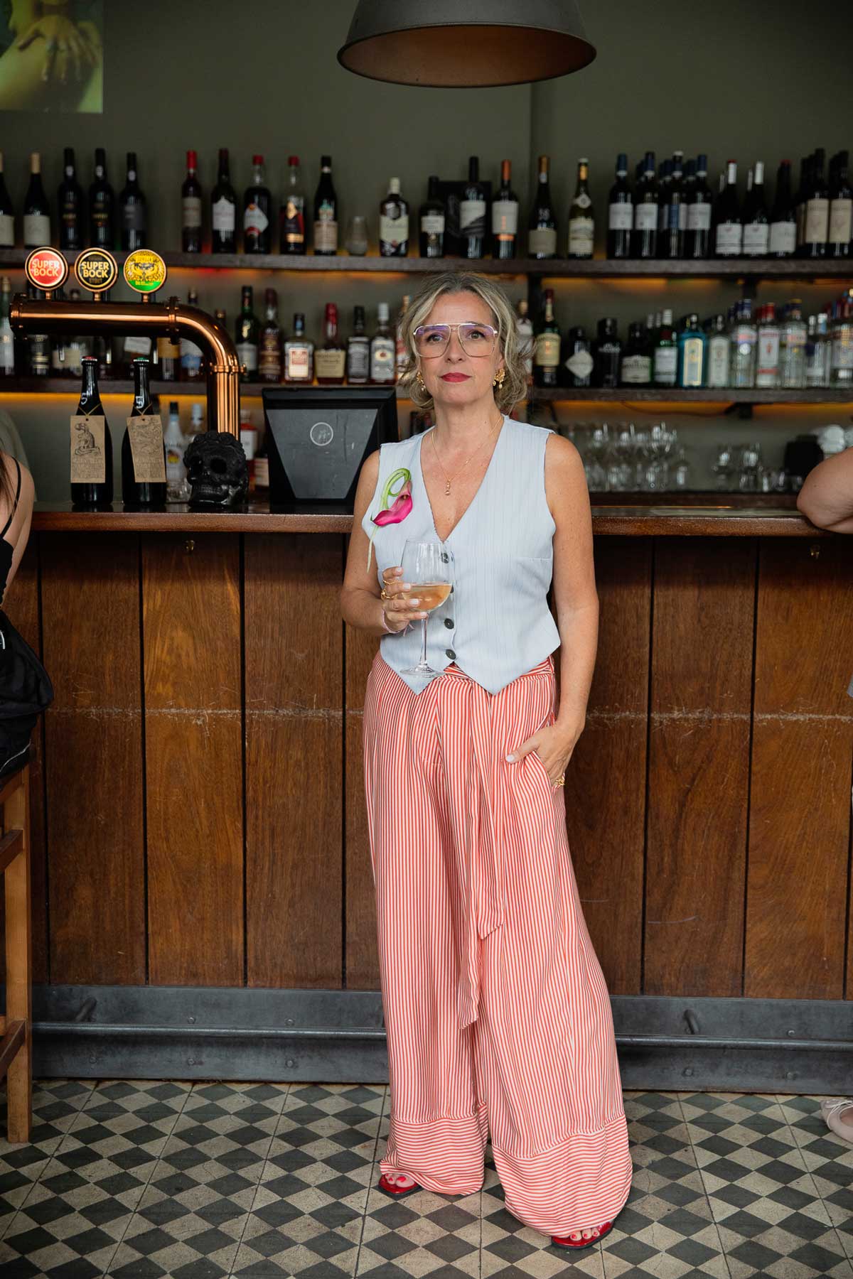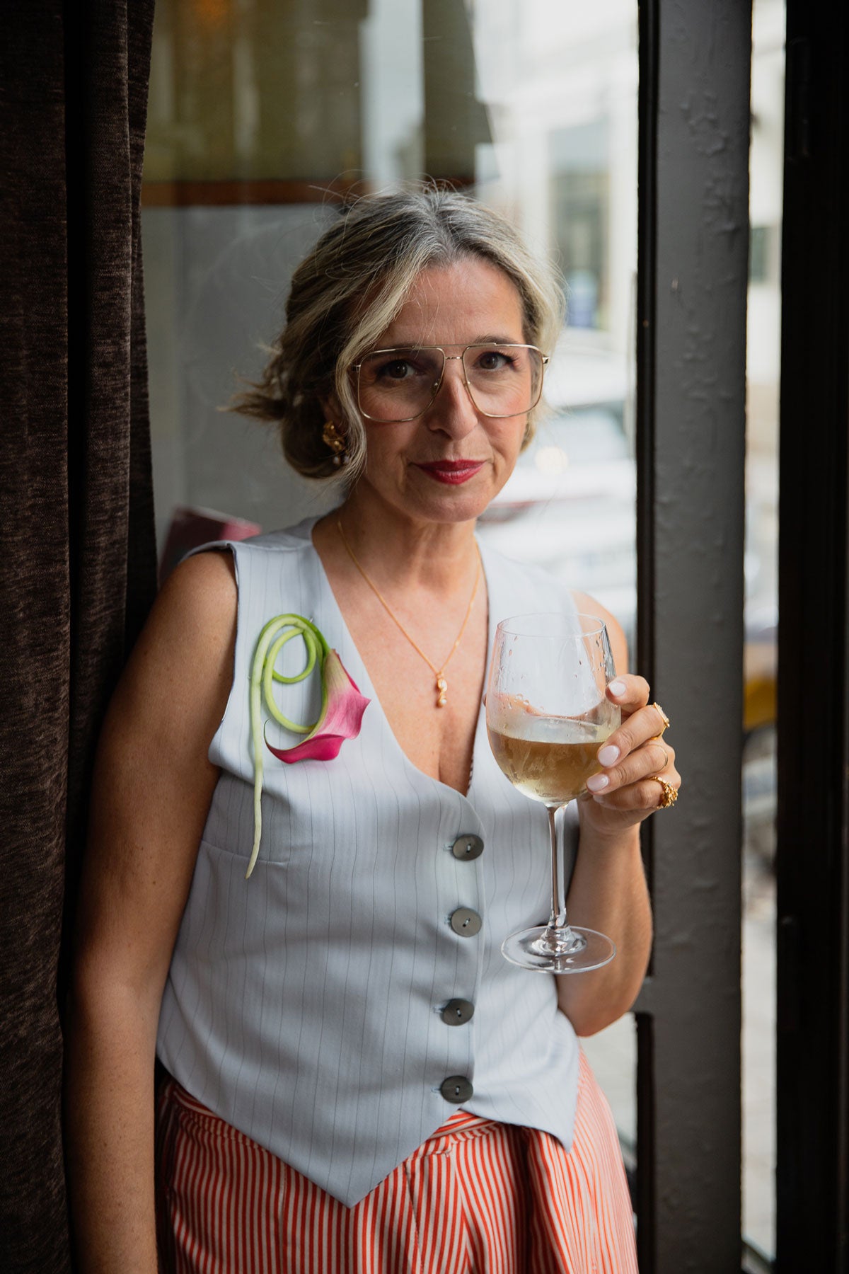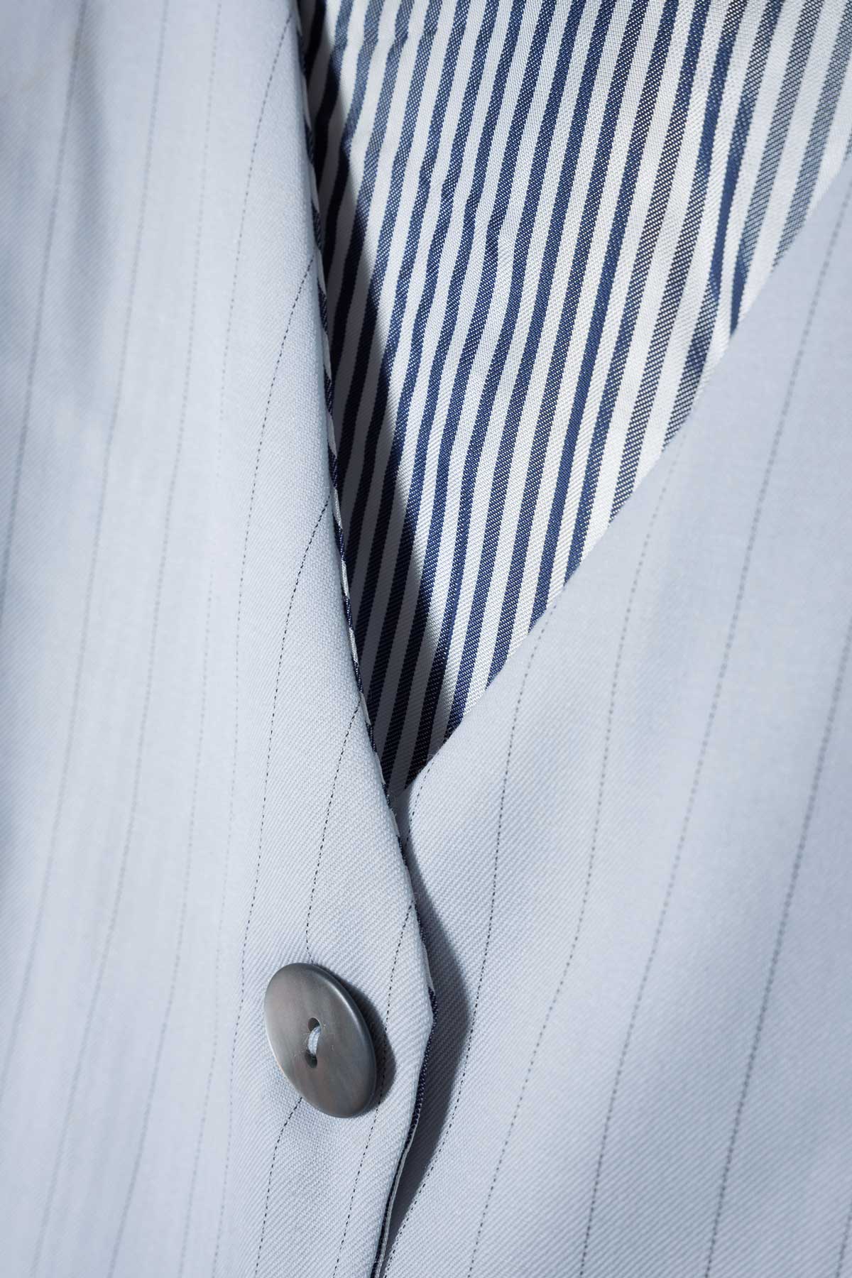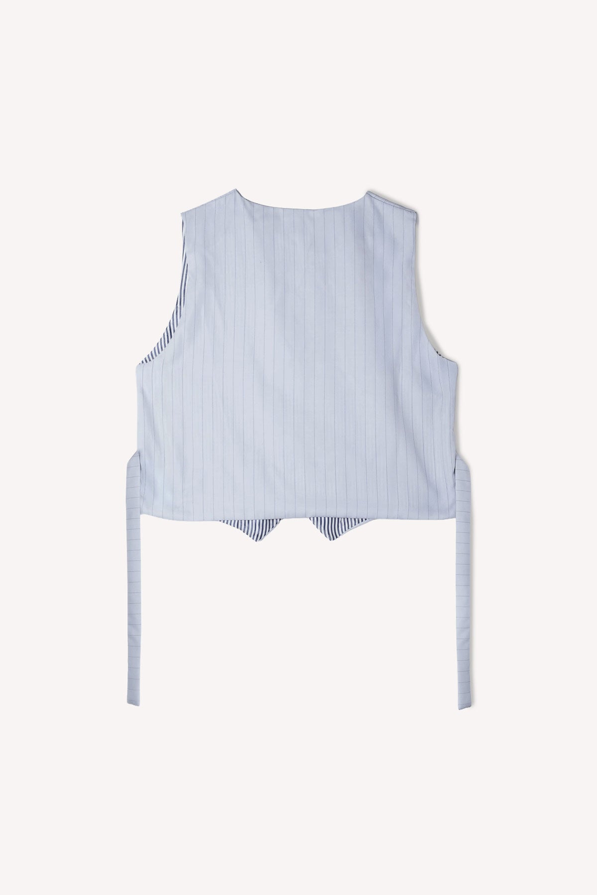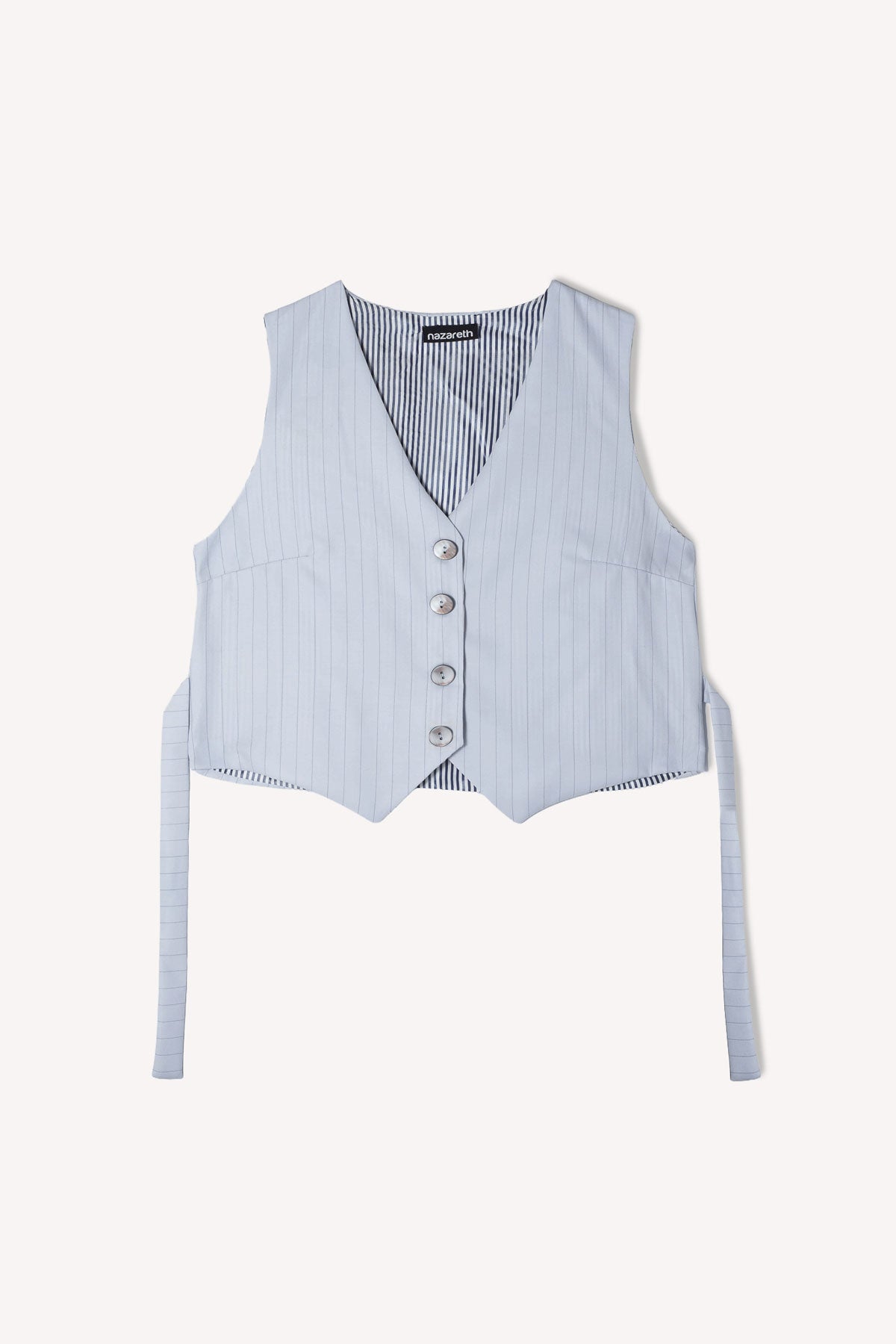 Colete classico com risca fina em azul bebé. Decote em bico e sem mangas com falsos bolsos frontais com abertura debruada. Fecho frontal com botões. Fita na parte de trás ajustável. Forrado.