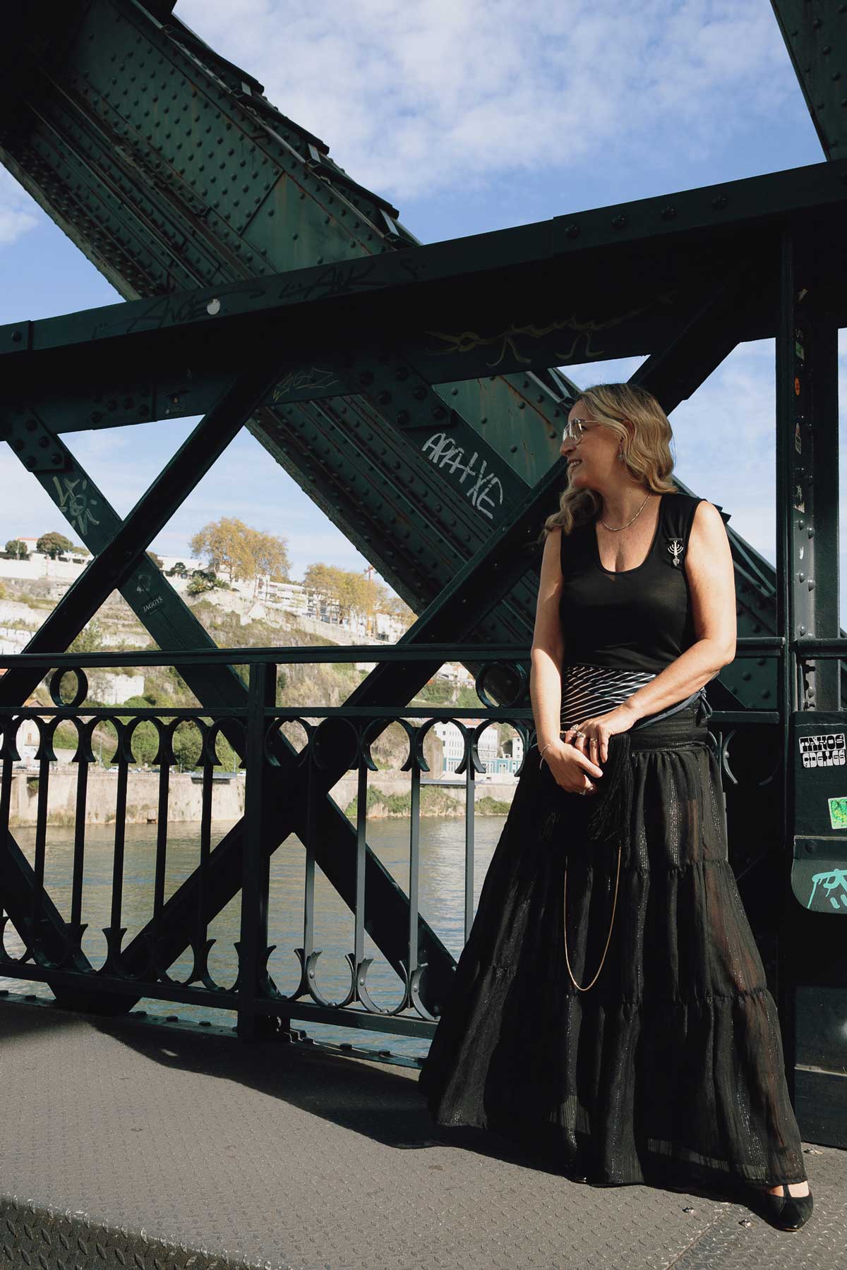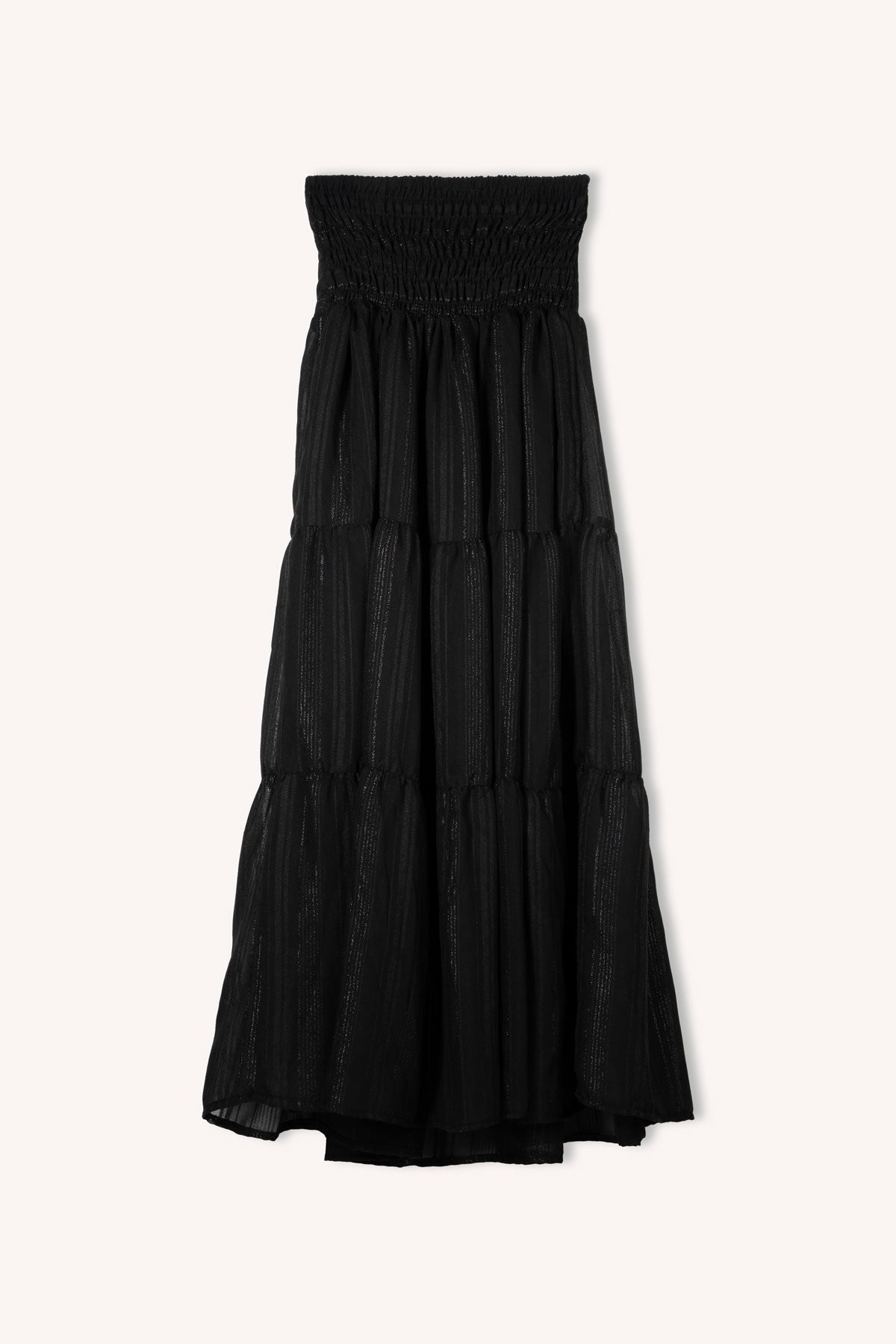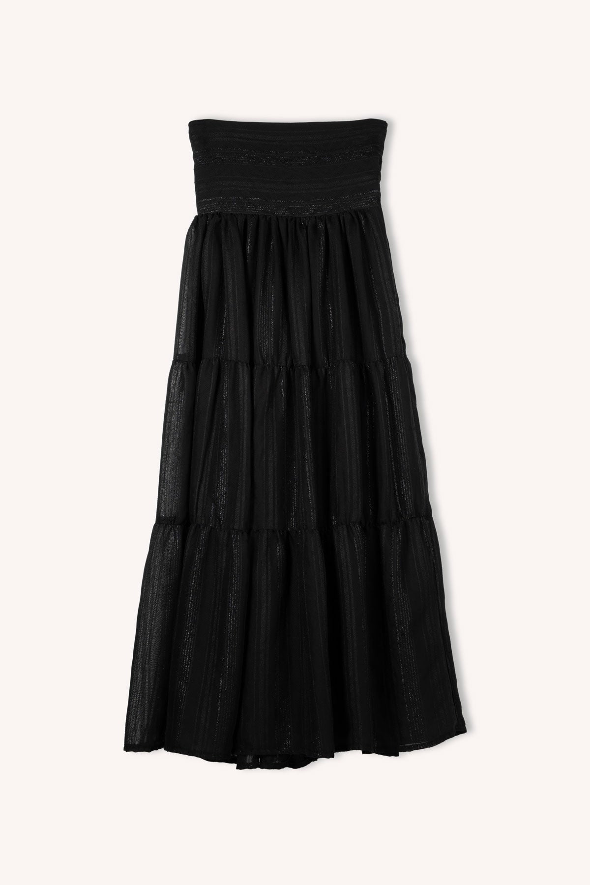 Saia comprida preta, larga em tule preto com risco prateado. Com uma cinta com elástico de altura de 30 cm. Ajustável a todas as cinturas.