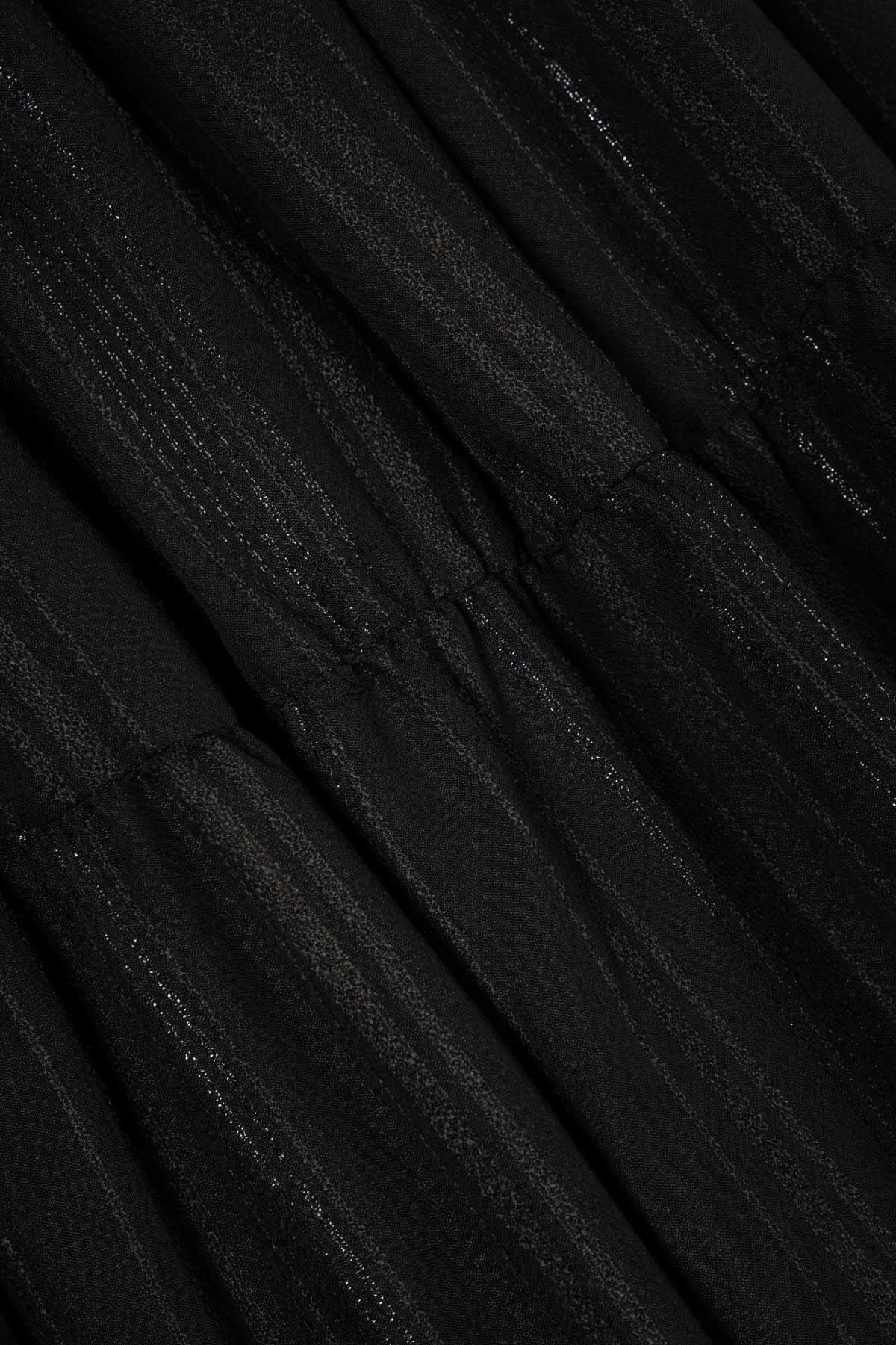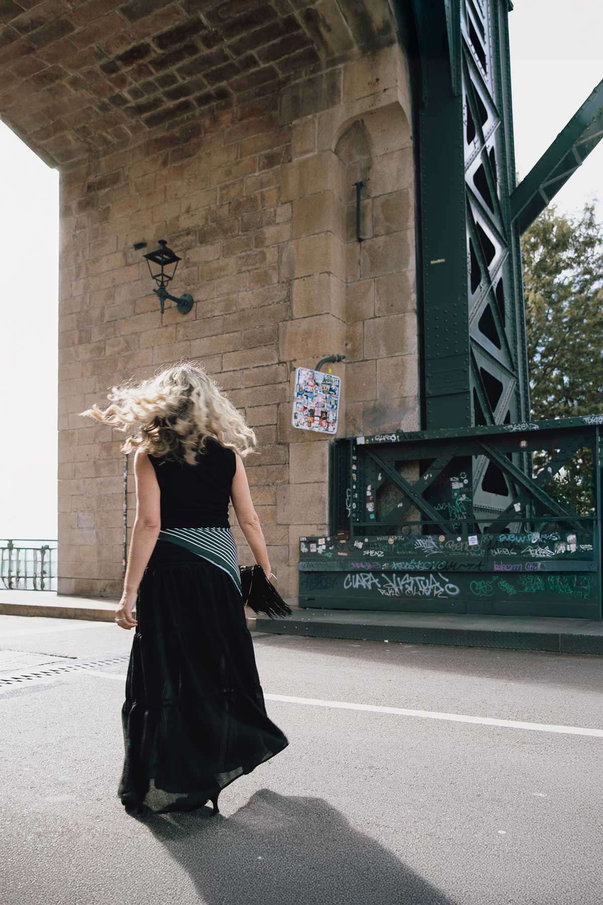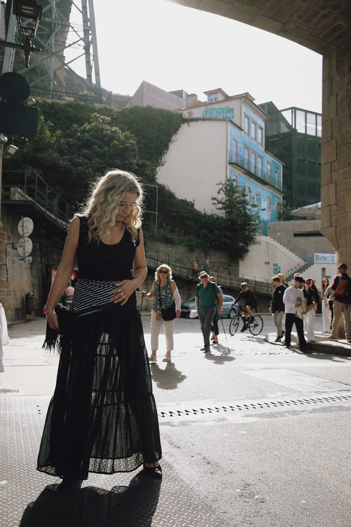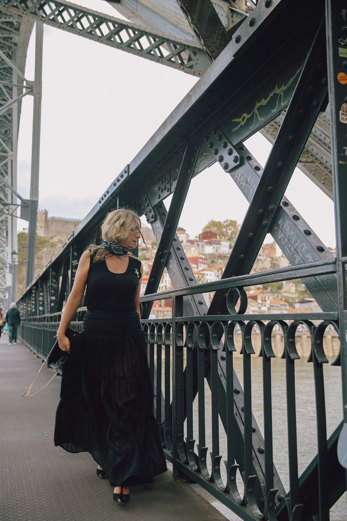Saia comprida preta, larga em tule preto com risco prateado. Com uma cinta com elástico de altura de 30 cm. Ajustável a todas as cinturas.