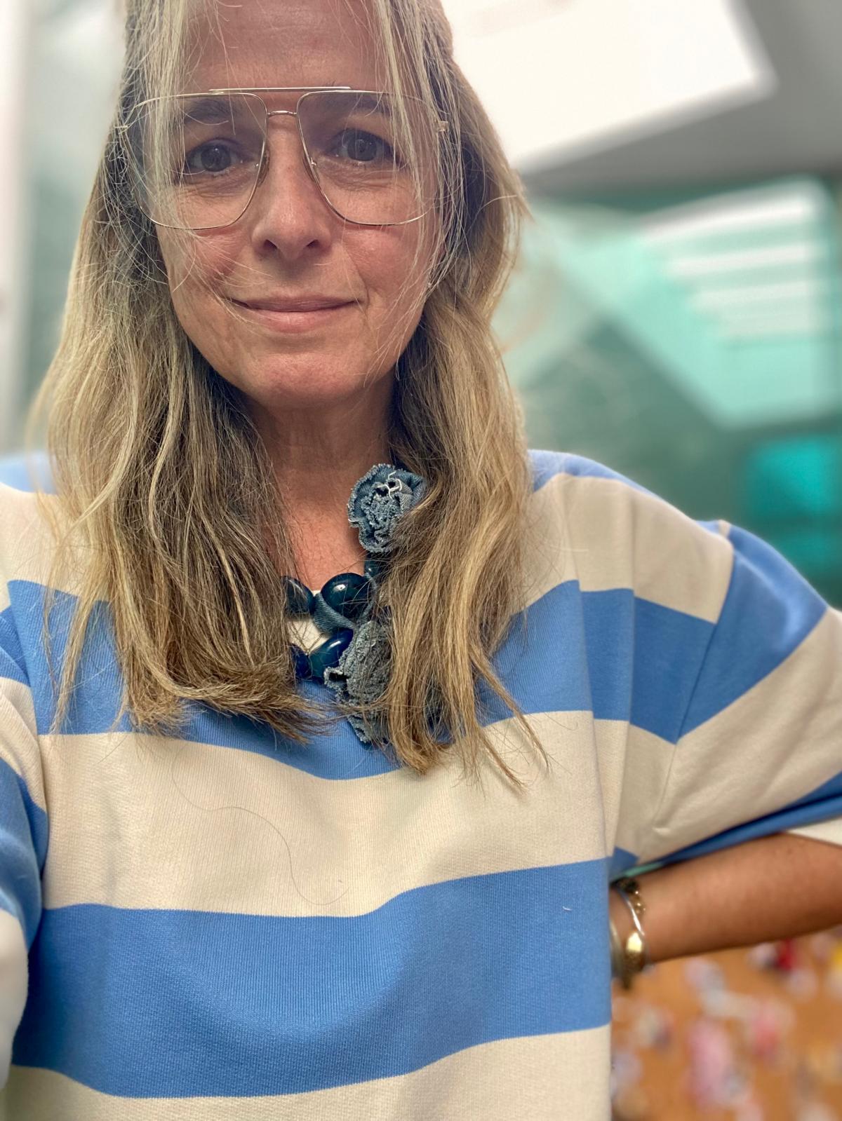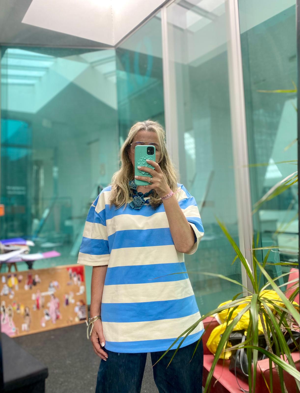 O corte oversize abraça o corpo com leveza e estrutura. Ombros descaídos, decote amplo e mangas até ao cotovelo criam uma silhueta fluida, descontraída, que vive entre o feminino e o masculino — sem rótulos, sem esforço.