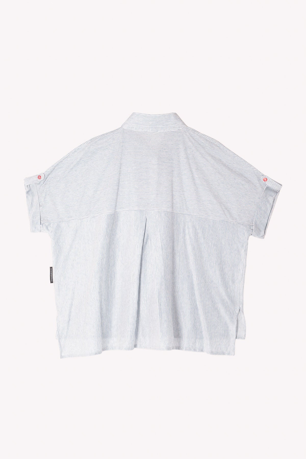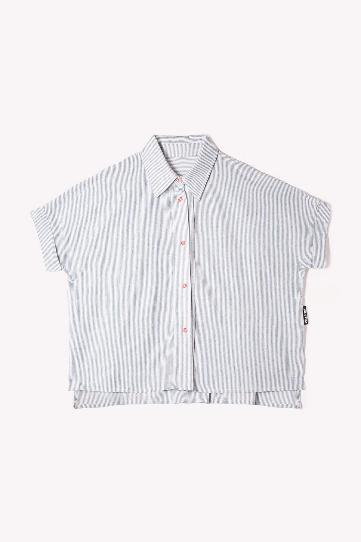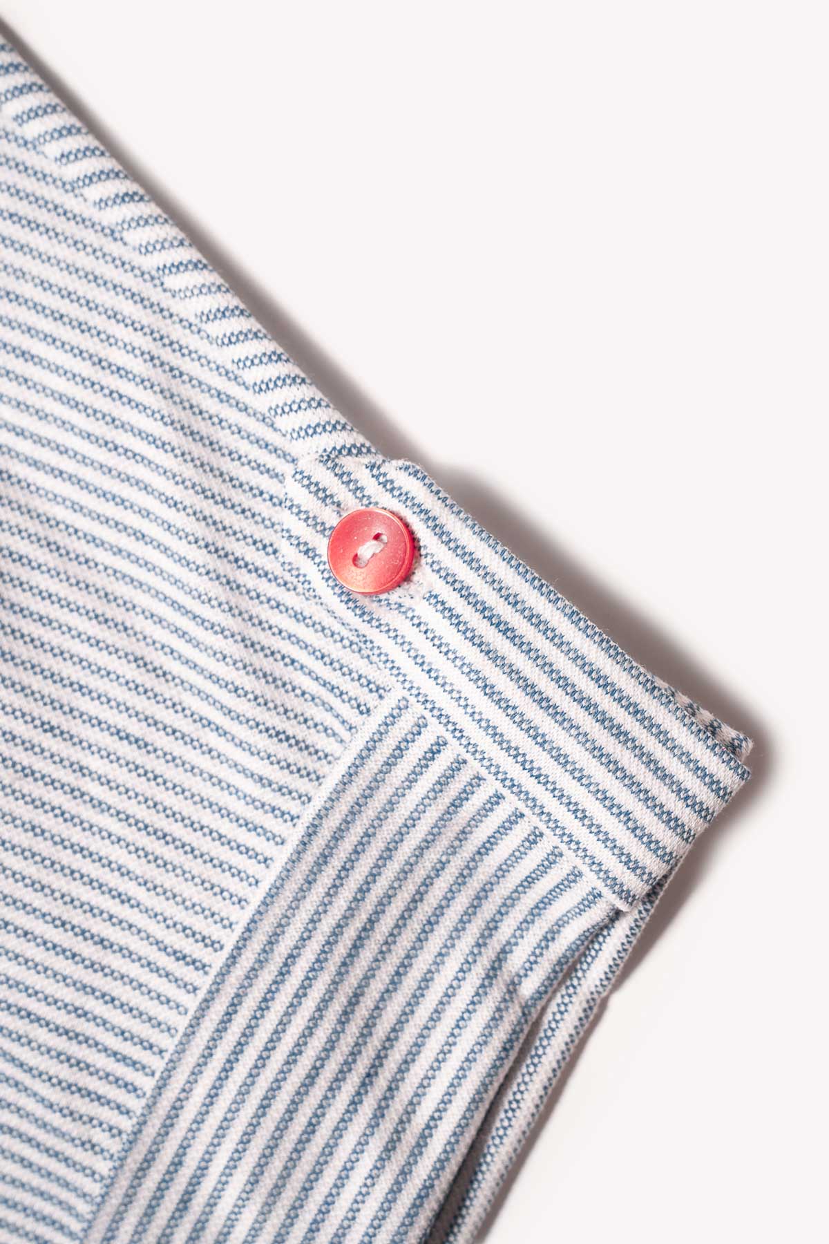 Camisa larga em algodão cinza e risca fina de manga curta com botões vermelhos.