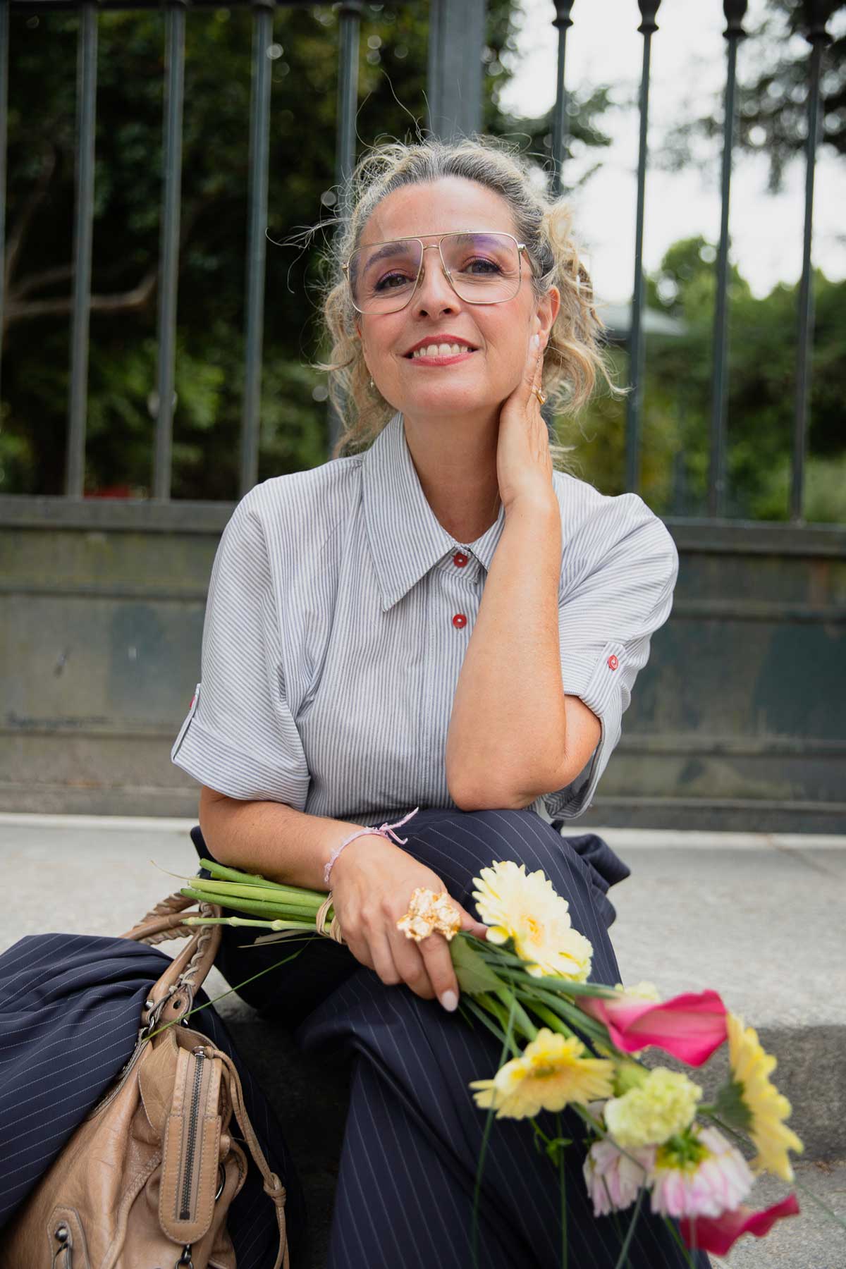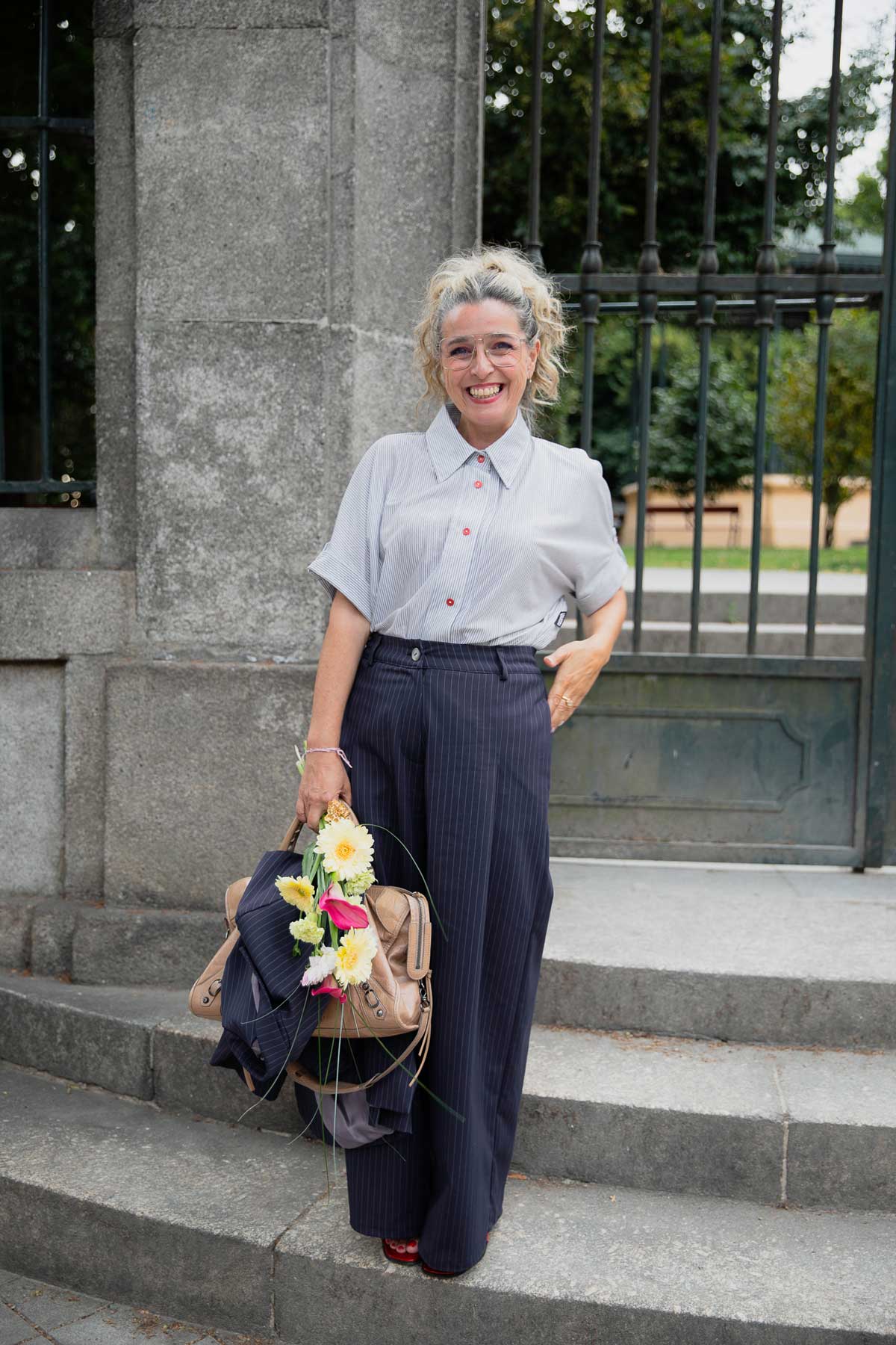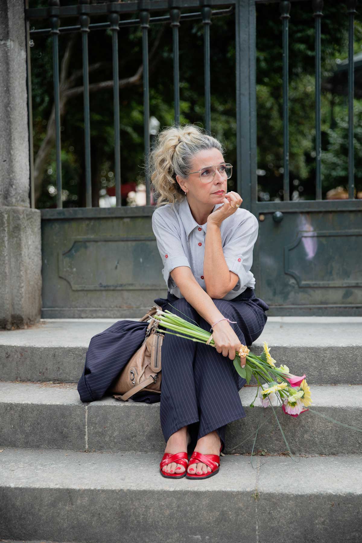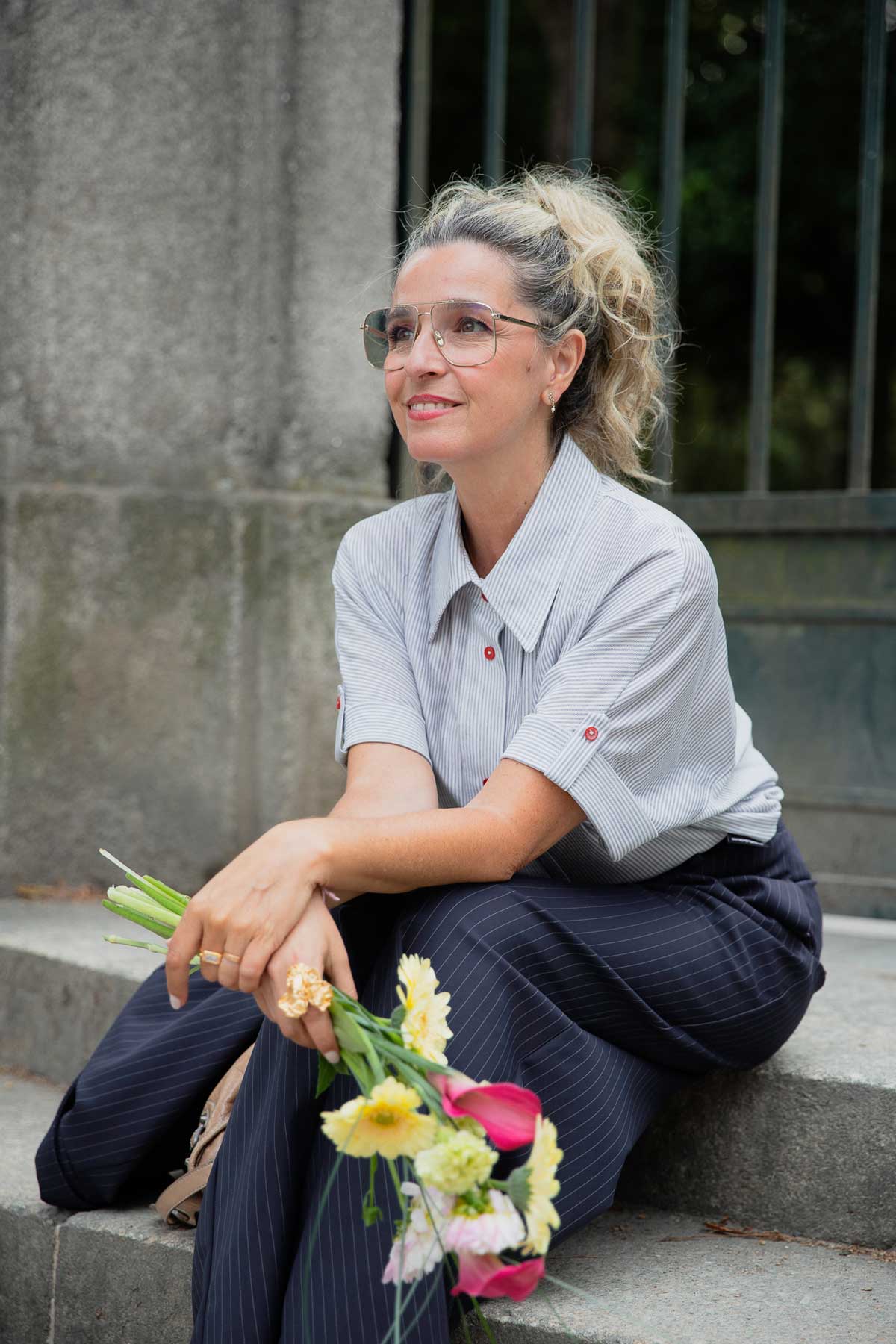 Camisa larga em algodão cinza e risca fina de manga curta com botões vermelhos.