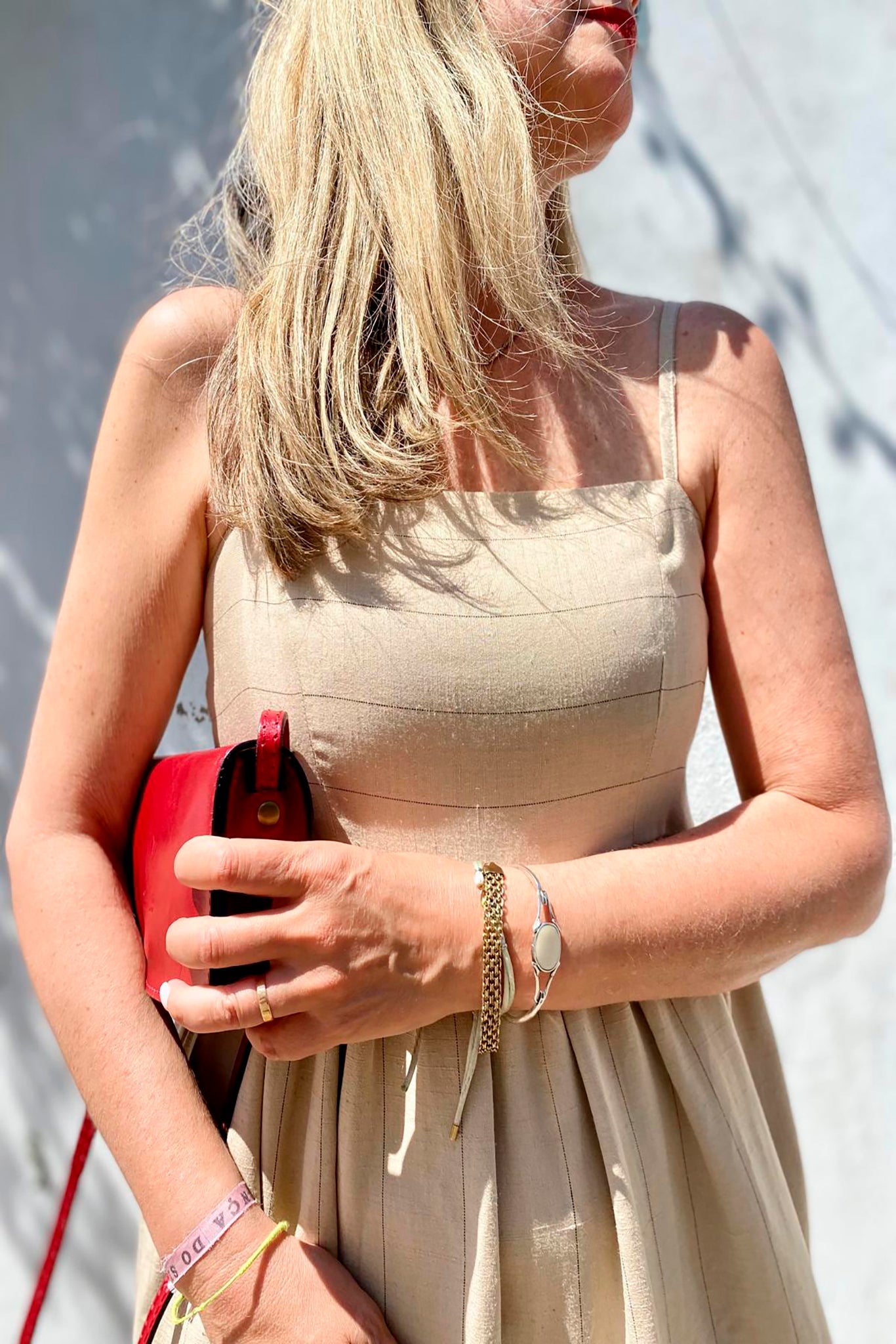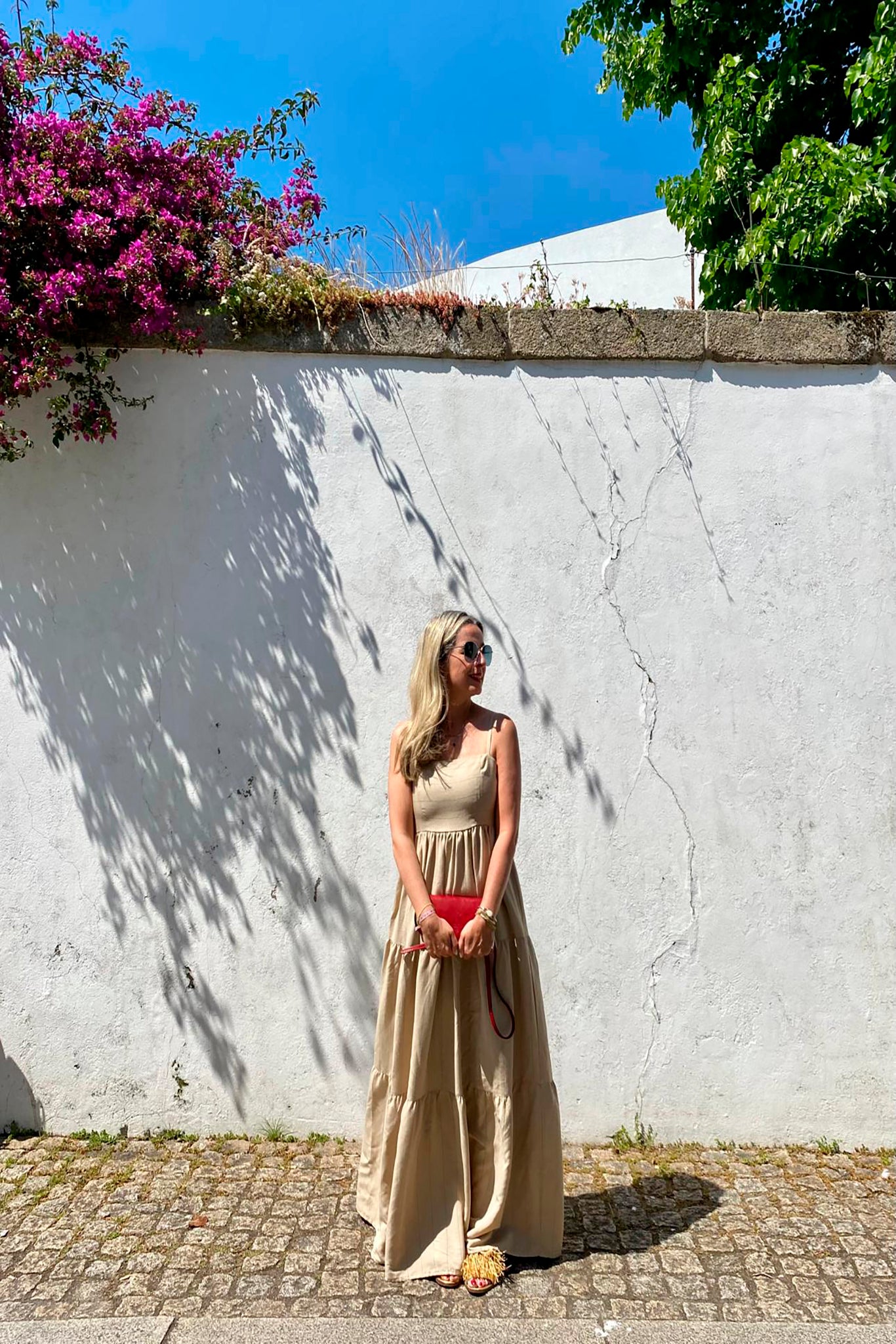 Leve, feminino e subtil, este vestido de alças finas é uma peça essencial para os dias quentes com estilo. Com um tom bege suave e riscas pretas discretas, oferece um visual elegante com um toque moderno e natural.