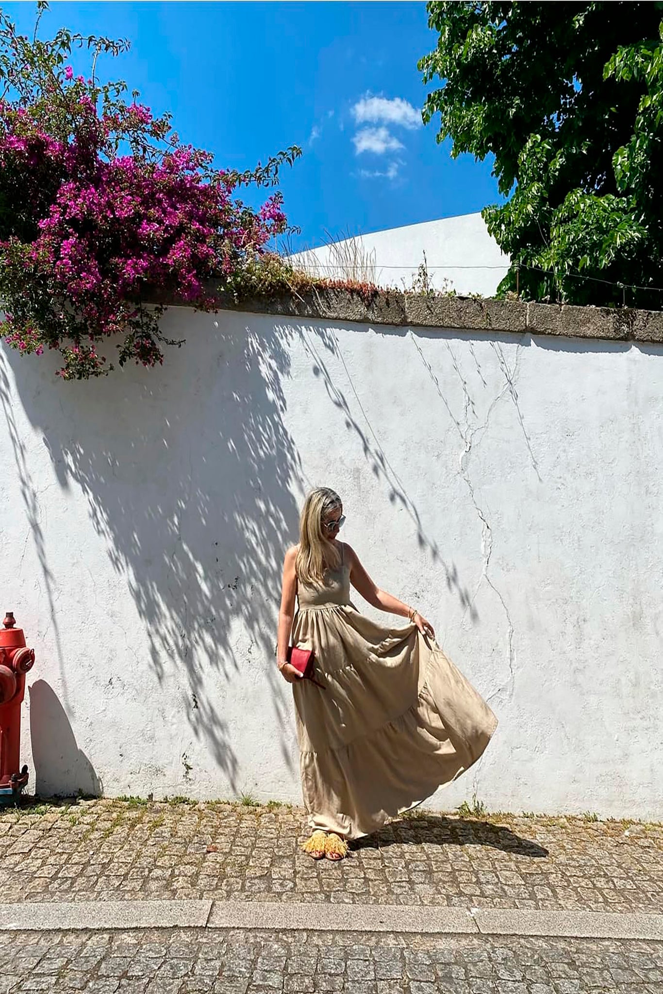 O destaque vai para os três folhos, que acrescentam movimento, fluidez e um toque romântico à silhueta. As alças delicadas realçam os ombros e o corte fluido adapta-se ao corpo com conforto e leveza.