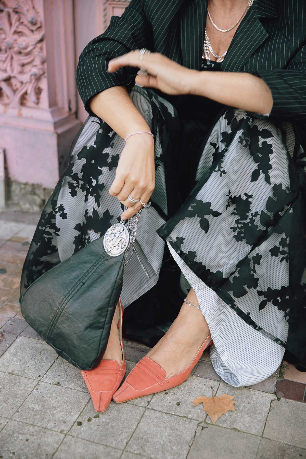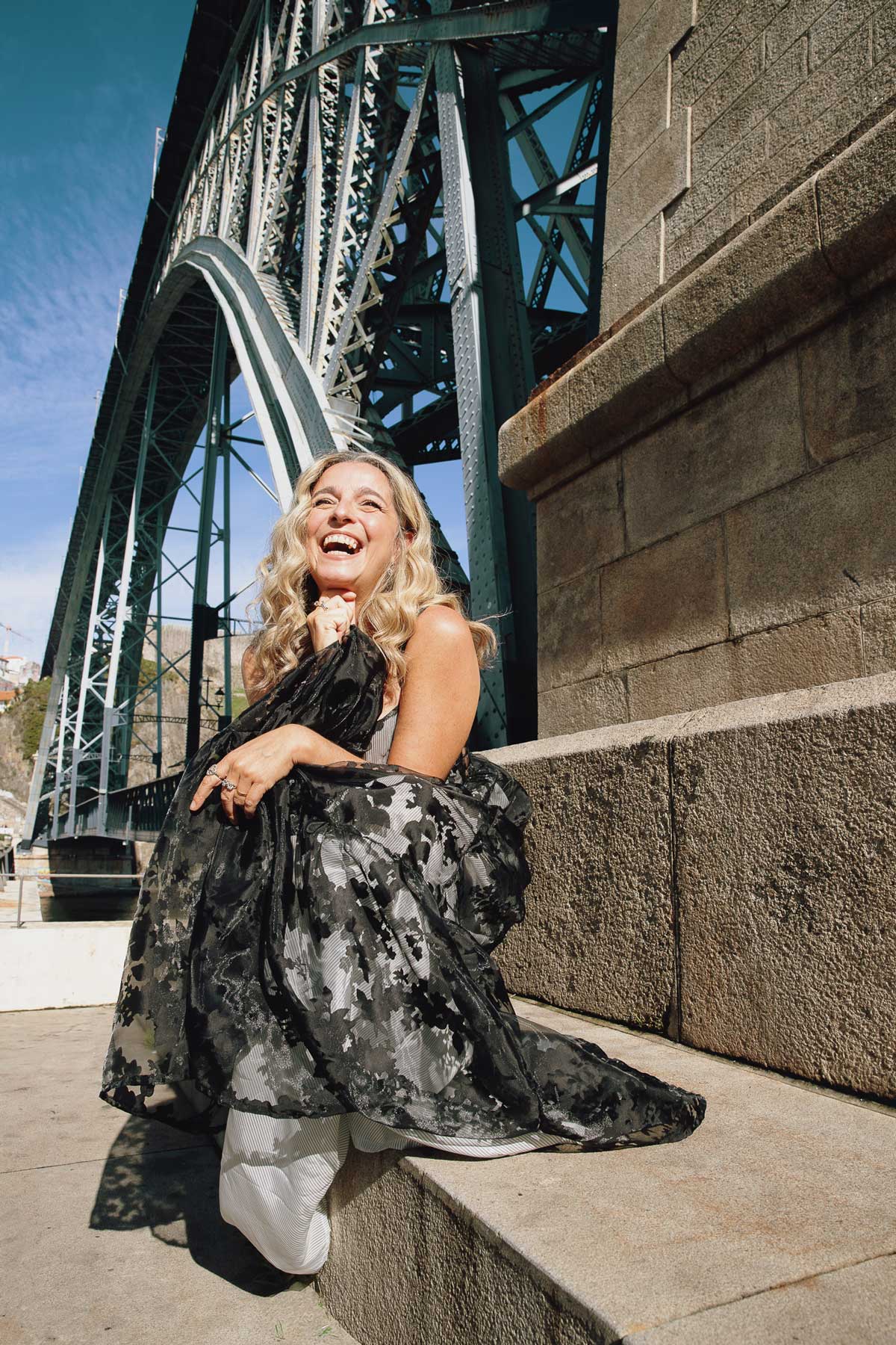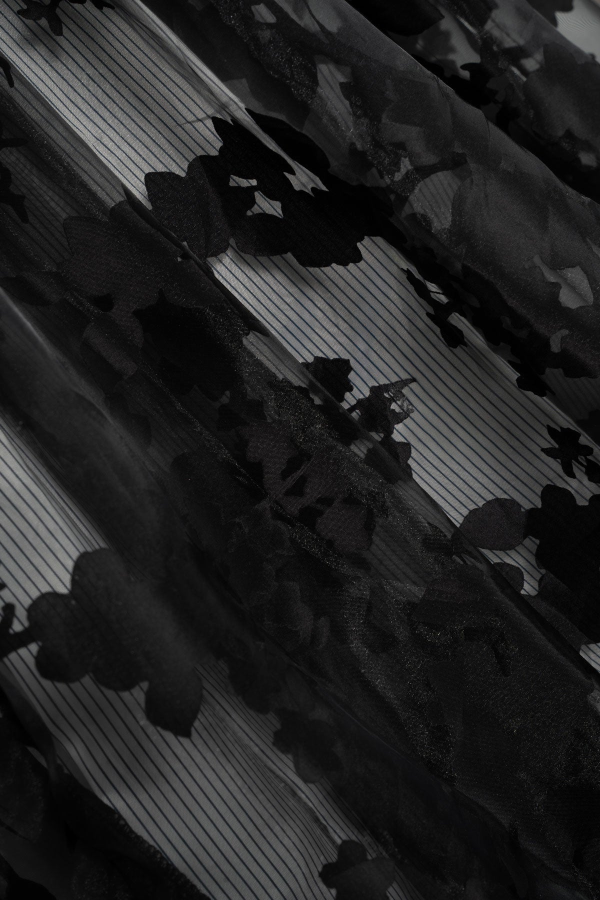Vestido de alças em tule transparente com flores pretas, com forro de cetim com risca fina preta. Dividido em 3 folhos grandes com volume. Comprimento até ao pés. Elástico nas costas para maior ajuste no peito.